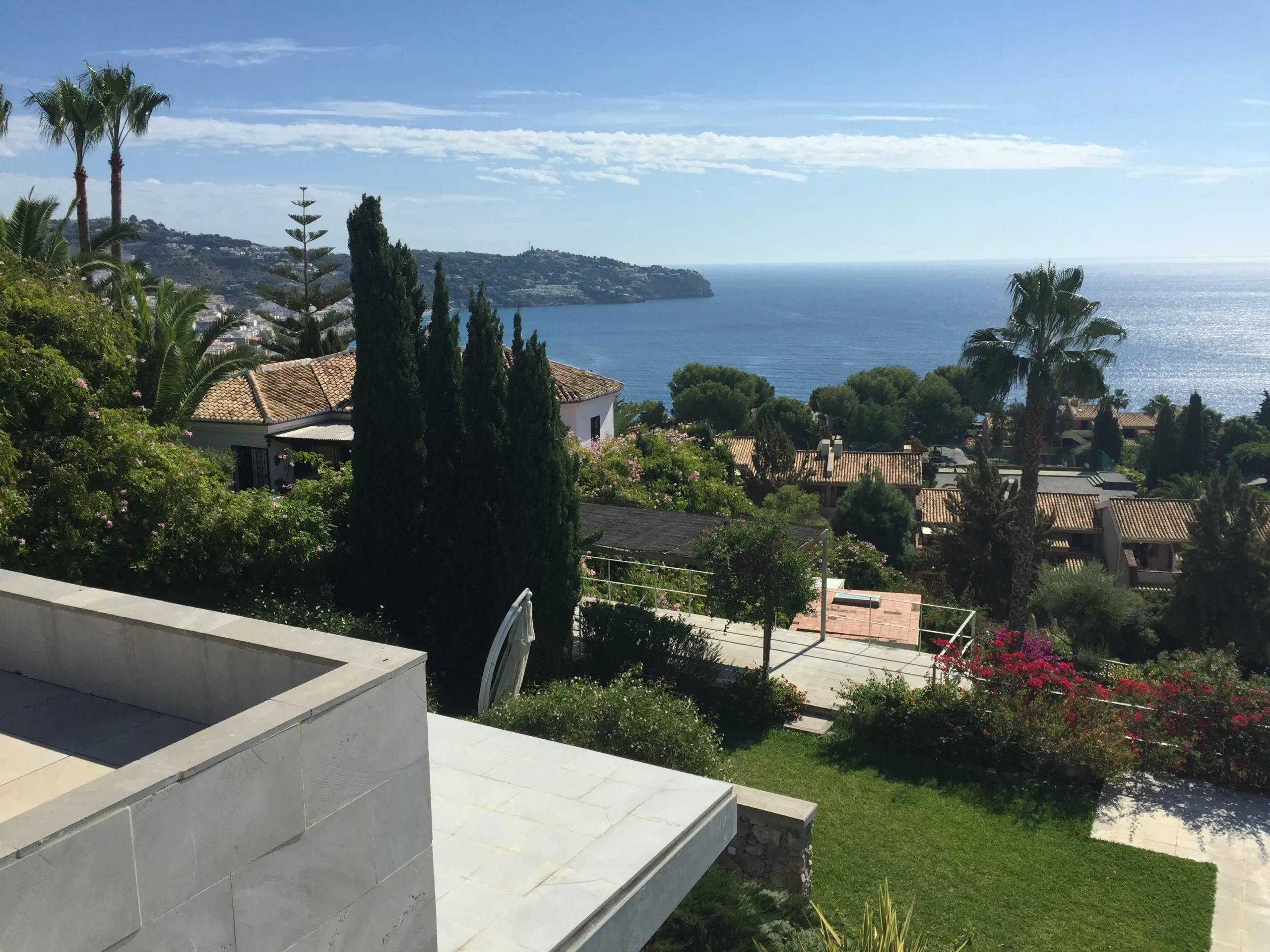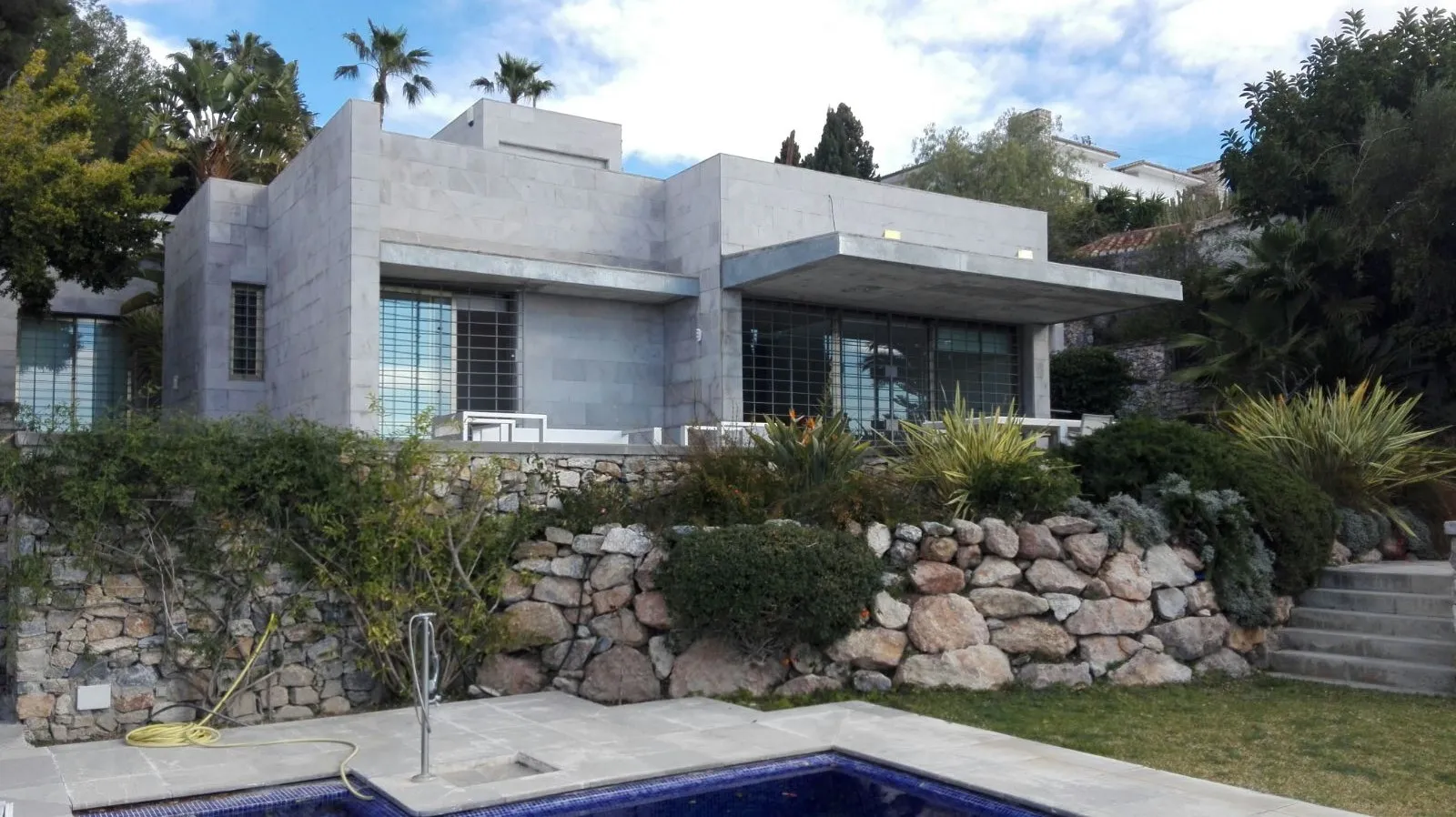 Por el exterior, la vivienda se muestra como un conjunto de volúmenes cúbicos revestidos de piedra de sierra Elvira, respondiendo a la discreción y sencillez de la respuesta formal y constructiva. Su desnudez arquitectónica se asoma a un íntimo jardín con piscina. La variada volumetría del edificio da lugar a recogidos patios, pasillos y cubiertas transitables, terrazas con excelentes vistas al mar.