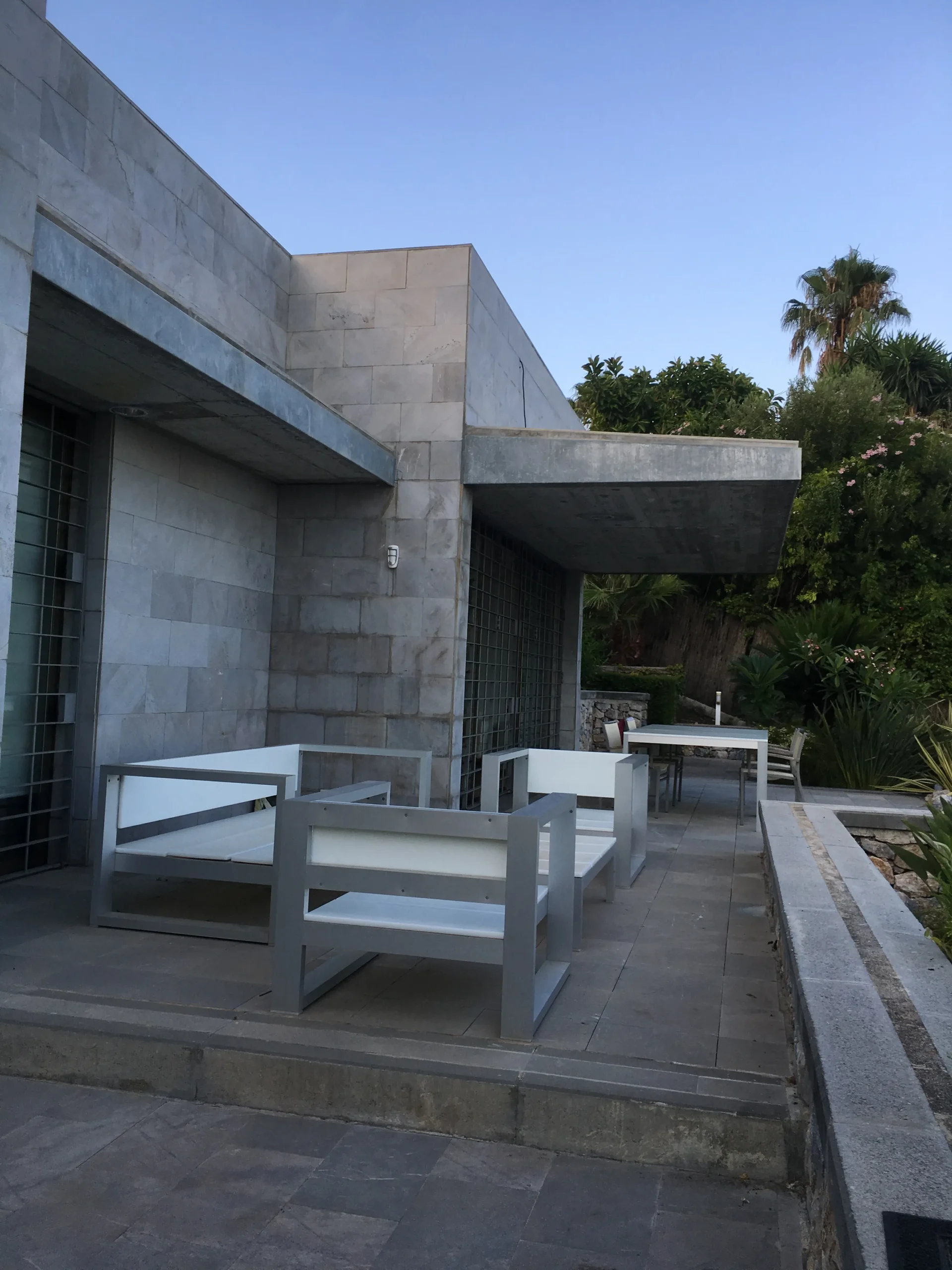 El edificio se adapta al terreno en lugar de imponerse a l. la voluntad de discreción y sencillez se manifiesta tanto en esta característica como en el tratamiento que se ha dado a las superficies exteriores, revestidas con bloques rectangulares de piedra de sierra Elvira gris.